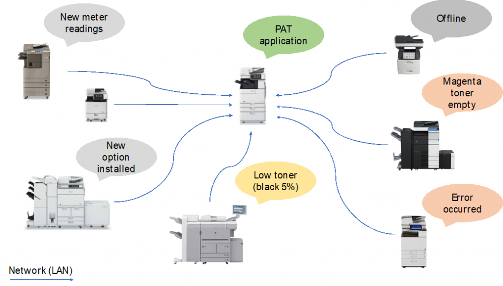 PAT is available as a MEAP application (for installation on Canon imageRunner Advance machines) or as a standalone Windows Application. One solution to collect all your data (counters, job logs, security audits, etc.), to provide you a reliable reporting and job accounting with a simple dashboard and e-mail notification upon desired event occurrence.